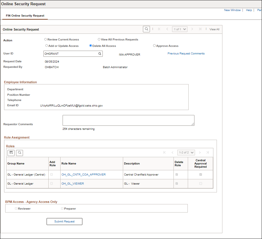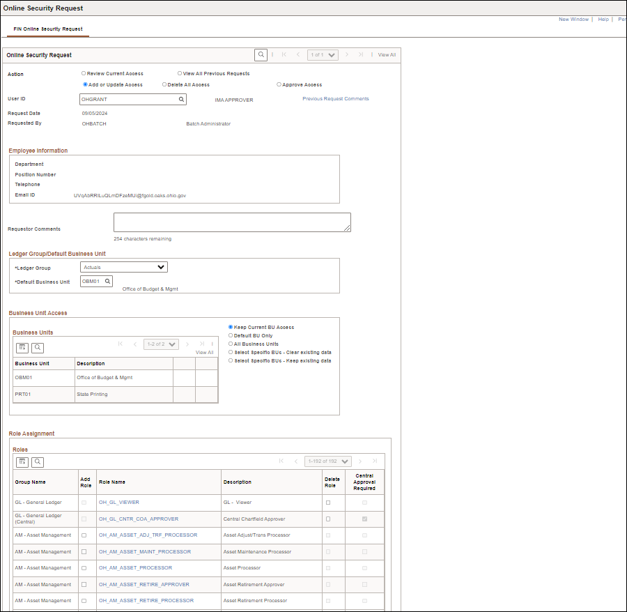 | OH_GL_AGY_COA_REQUESTOR – Agency ChartField Requester | Grants access to the ChartField request forms. The user can create and submit requests to add a new ChartField or request an update to an existing value. |