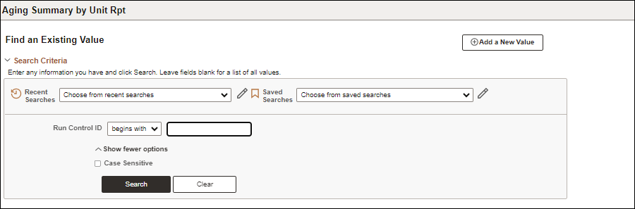 - When a report is run in OAKS, the user will need to work with a Run Control ID. A Run Control ID is simply a name assigned to a report run request so it can quickly be retrieved when the user needs to reference it again. It is recommended that a single Run Control ID is created and reused each time similar reports are run, changing the parameters as necessary. Therefore, the same Run Control ID can be used for multiple reports. A new Run Control ID can also be created using the Add a New Value tab.